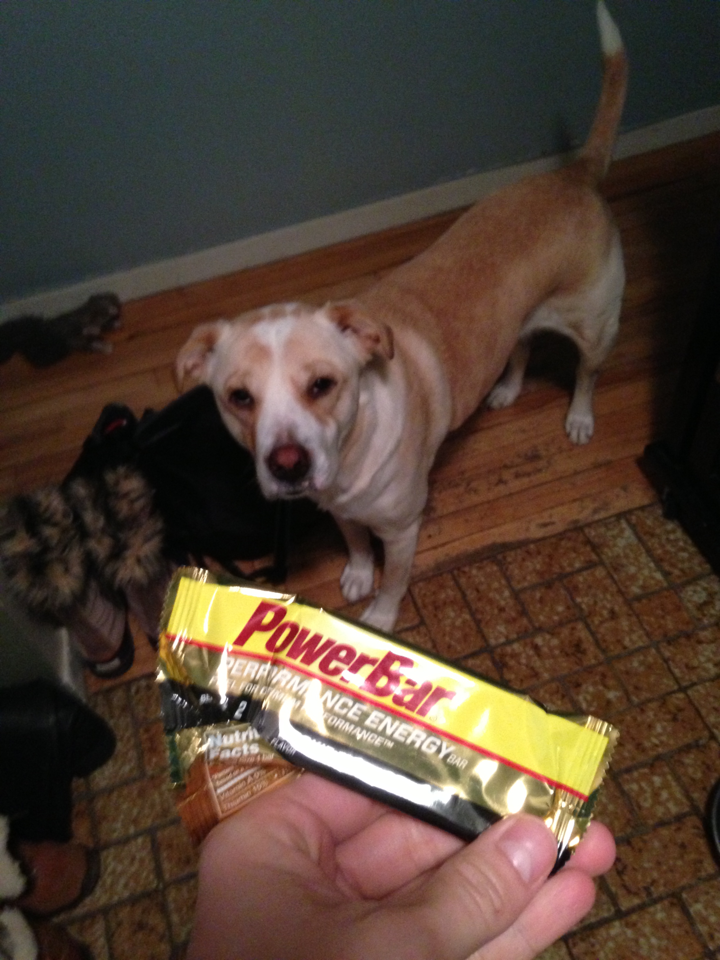You know PowerBar must be doing something right when even your dog springs from her bed to see what you’ve opened to eat. We powered up and headed out for our workout…Fetch repeats in the park on a hill!