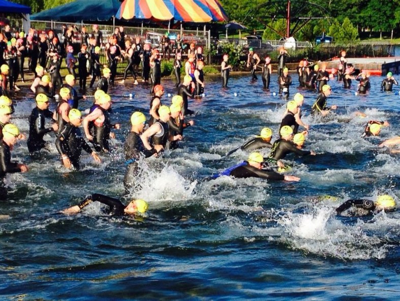 Pulling those knees high I walked till the water was about chest high and dove off toward the first swim marker. What felt like longer than it should I reached marker one. Fists & feet were flying around me so moved to a more inside track. Market two down…now the turn….a quick torpedo turn…”hey this is going well,” I think to myself “I always race Quassy well.” A third down and heading toward the second set of markers and then the final third and start sighting the big water slide to head for swim exit.