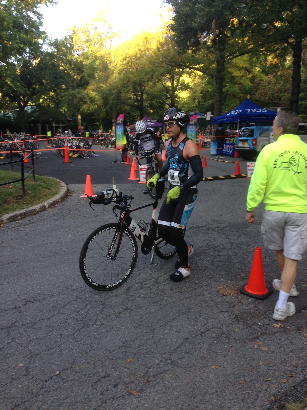 That said I ran faster than I wanted and covered the 2.12 miles in 16:00. With a surprised look on my face I jumped on the bike and held back for the first mile. Spinning out my now heavy legs. Once, I found my cadence and cleared my lungs with plenty of fresh oxygen I put my head down, tucked in and proceeded to get to work. Knowing I had plenty in the tank for the bike I pushed my pace on the first loop, 6.2 miles down in under 17 minutes I thought to myself, “you can give more, 16 minutes or less!” I would have been late if I was a pizza deliver guy I push and pulled my way back to transition after the second loop for a total time of 33:02 the 7th fastest bike split on the day and one hell of a big smile!
